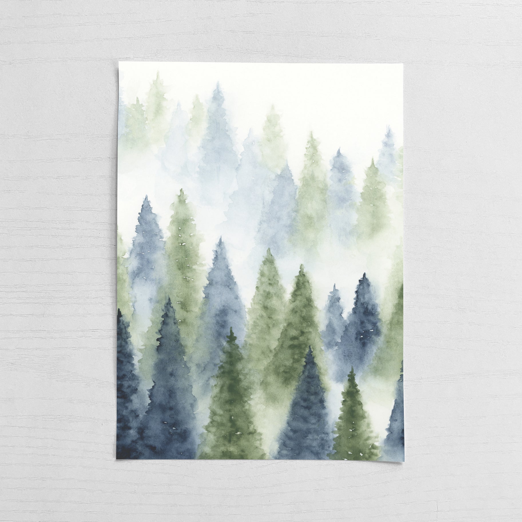 This blue and green foggy forest art piece was created using watercolor. It is inspired by trips over the pass in Oregon.