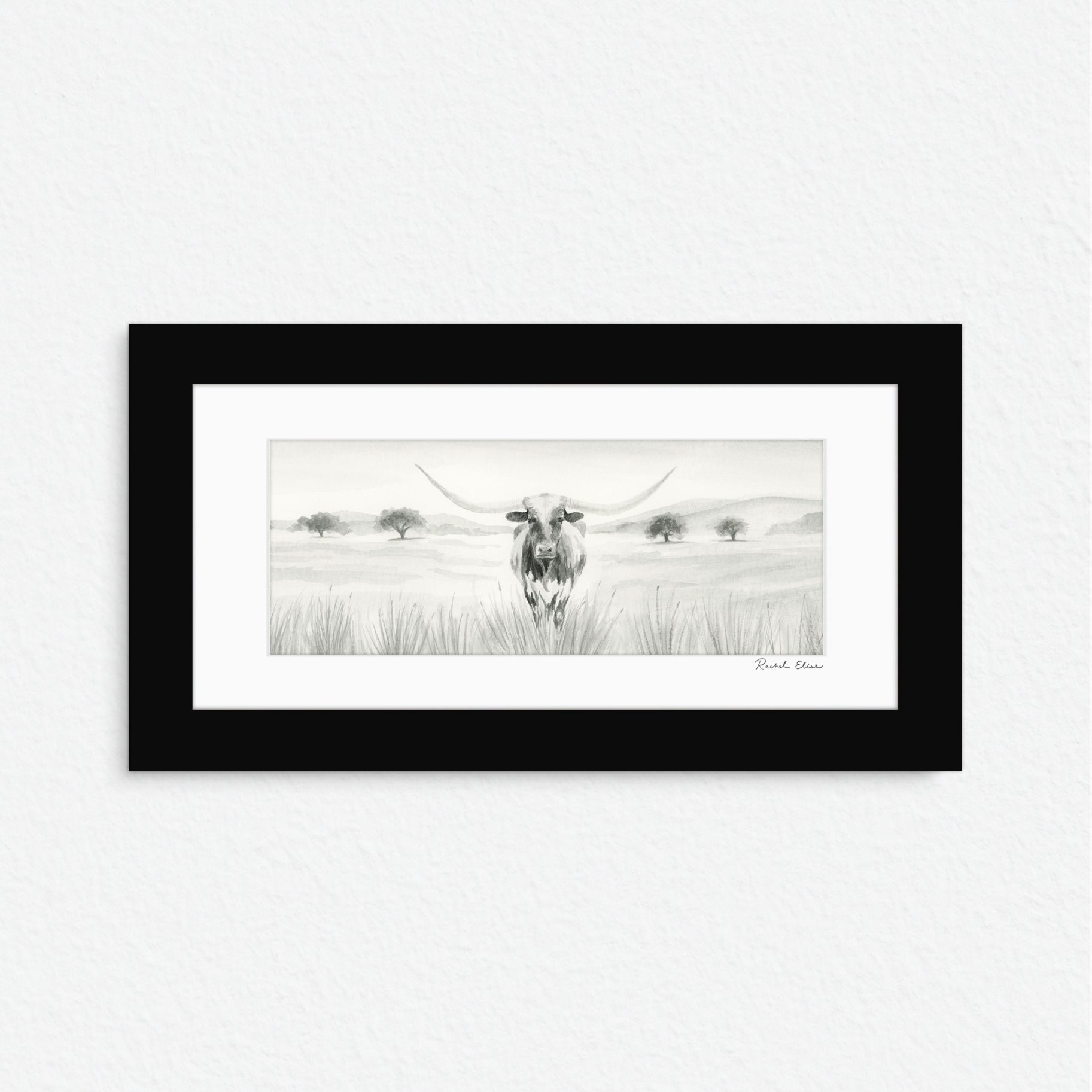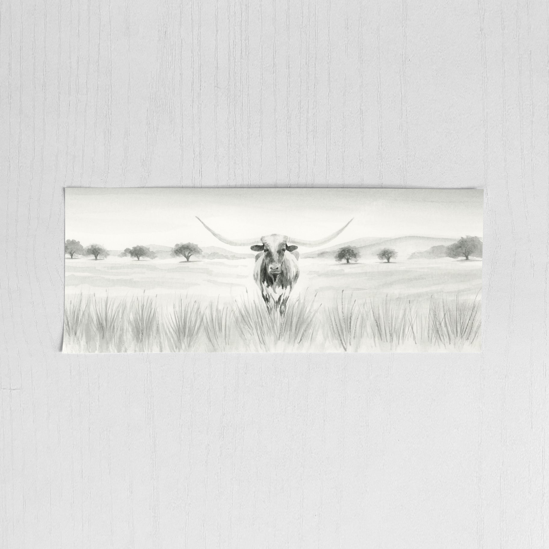 This black and white longhorn on the pasture art piece was created using watercolor. Inspired by rural Texas.