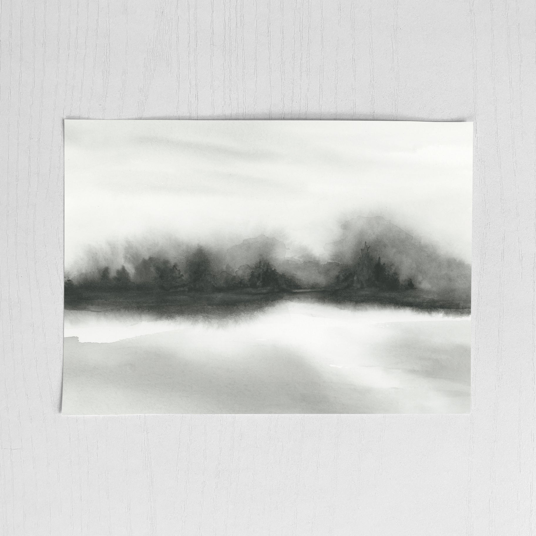 Black and white river and tree reflection watercolor painting. Classic and timeless art for rustic farmhouse style home wall décor.