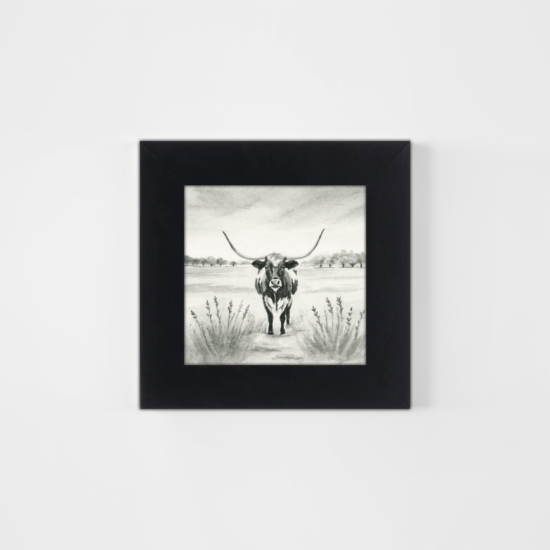 This black and white longhorn in a field miniature is an original watercolor painting, inspired by rural Texas.