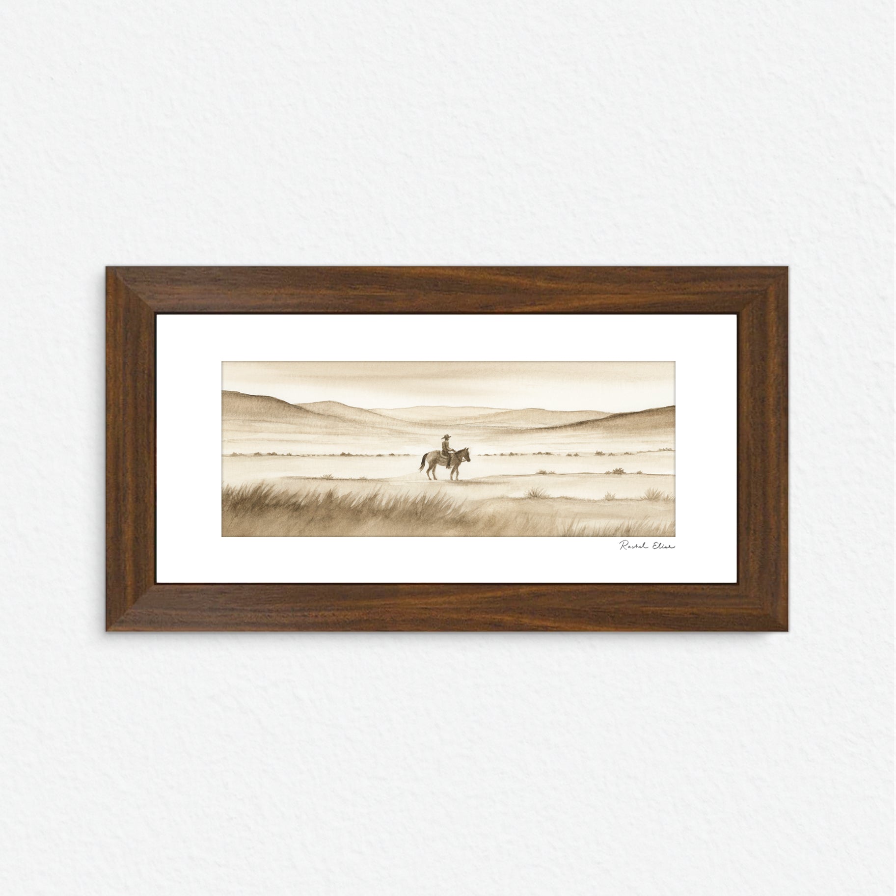 This monochromatic sepia brown cowboy on a prairie art piece was created using watercolor. Inspired by rural Texas.