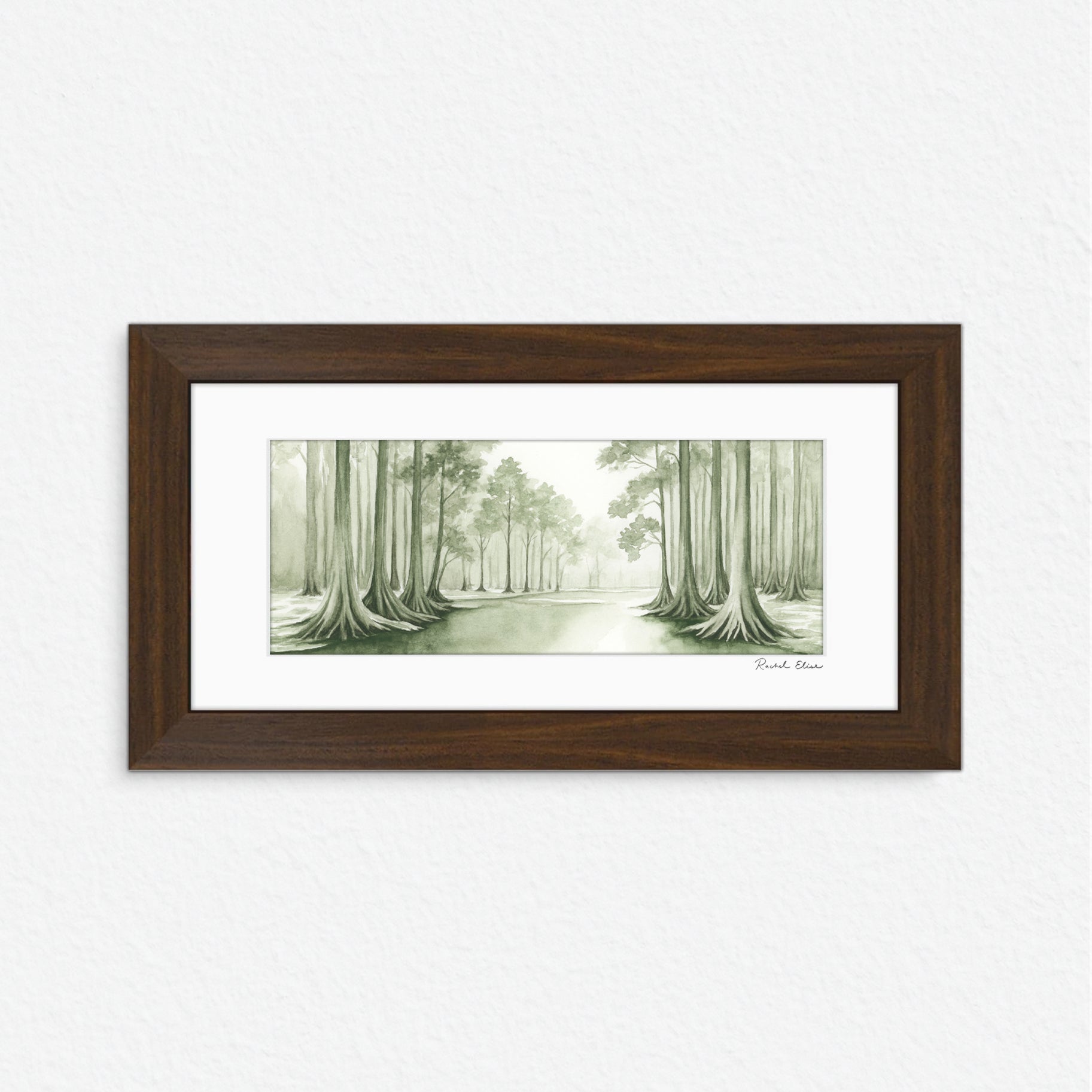 This sage green bald cypress tree along a river art piece was created using watercolor. Inspired by the rivers in Central Texas.